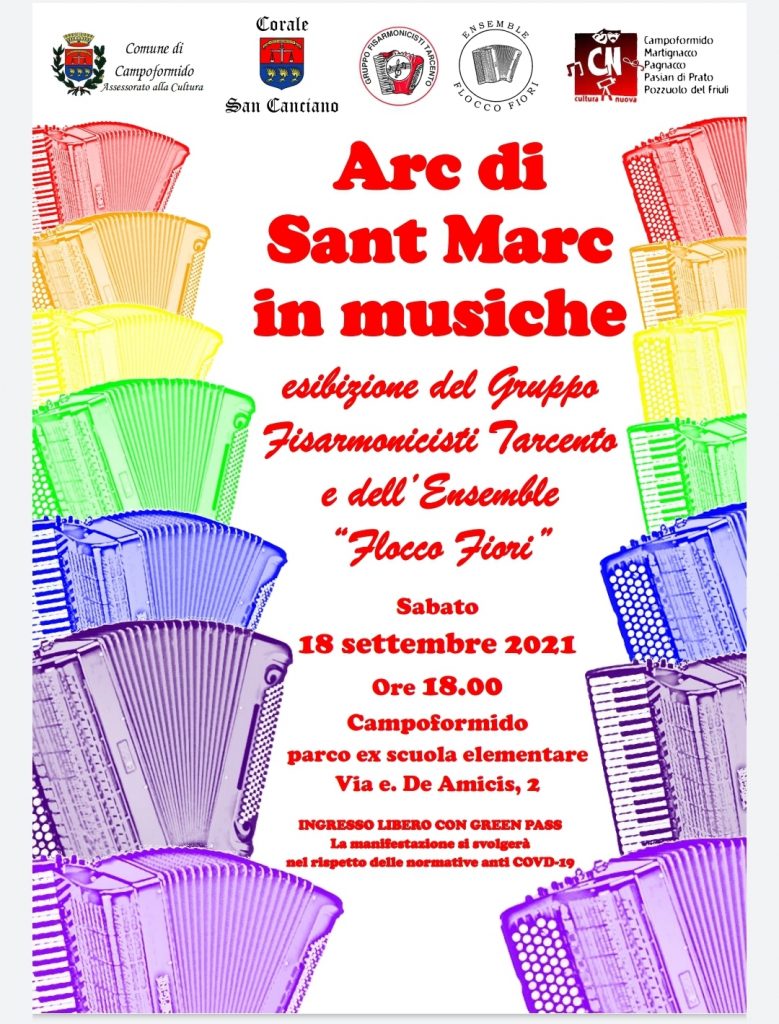 Si chiude una stagione che ha visto nuovamente appuntamenti dal vivo a Campoformido e la “Corale San Canciano” saluta l'estate proponendo alla popolazione “Arc di Sant Marc in musiche”, concerto di fine estate che avrà come protagonisti il Gruppo Fisarmonicisti Tarcento e l'Ensemble Flocco Fiori.