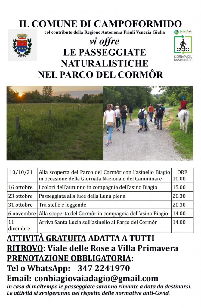 In occasione della “Giornata del Camminare” di Federtrek, il Comune di Campoformido, amico delle api, assessorato all'Ambiente, Cultura e Turismo, col contributo della Regione Autonoma Friuli Venezia Giulia presenta sei incontri dedicati alla promozione del Parco del Cormôr in compagnia delle guide Laura Fagioli e Pierino Picco, col mitico asinello Biagio.