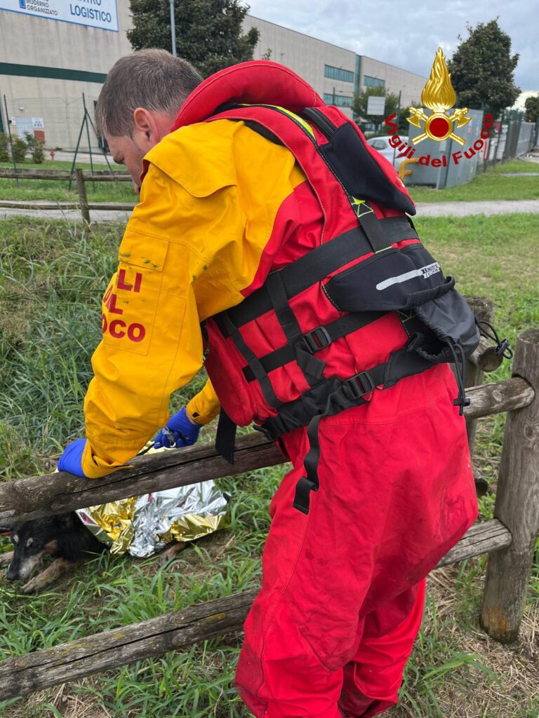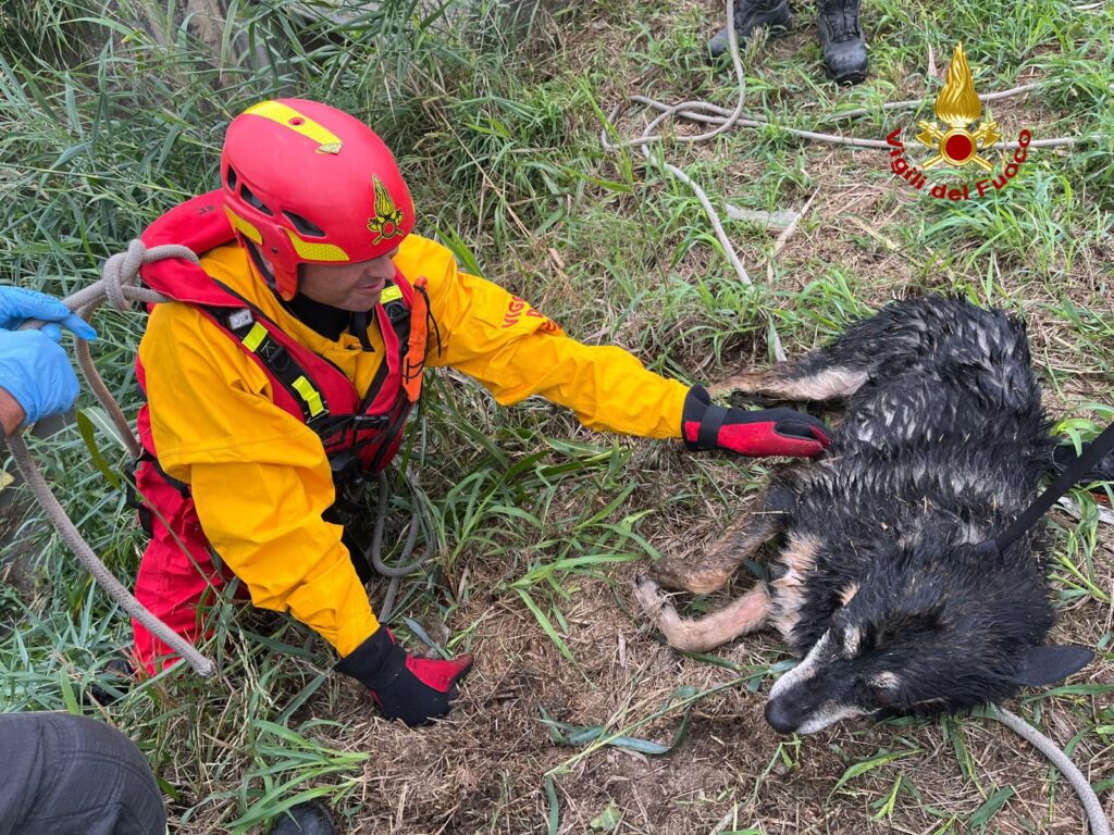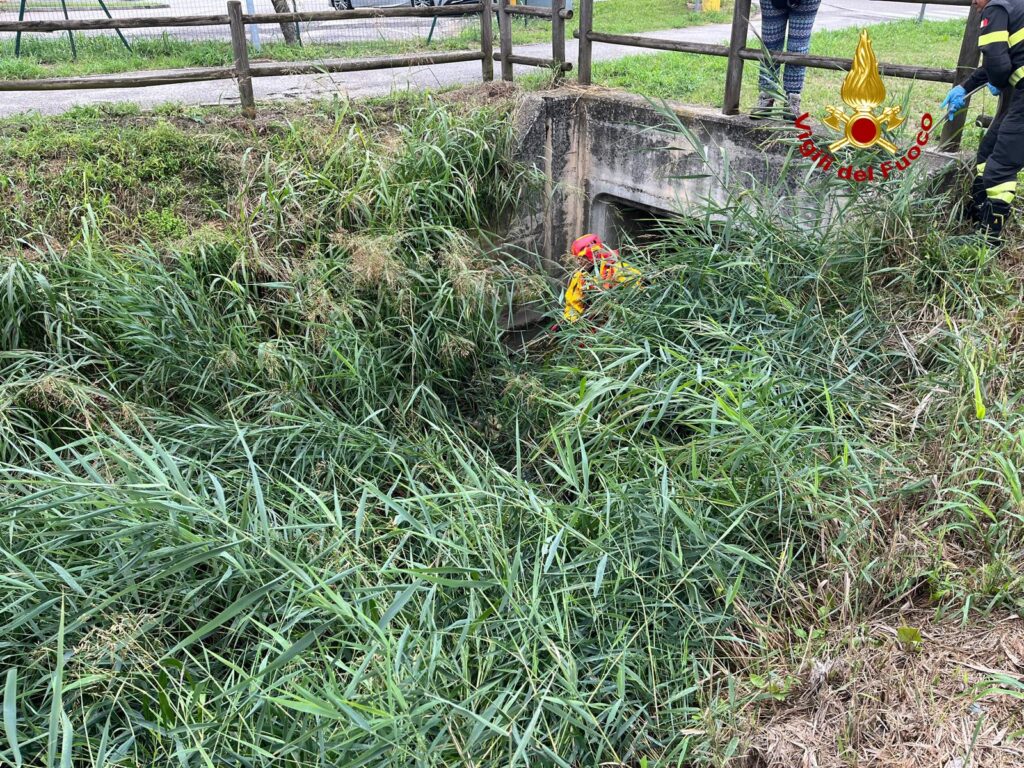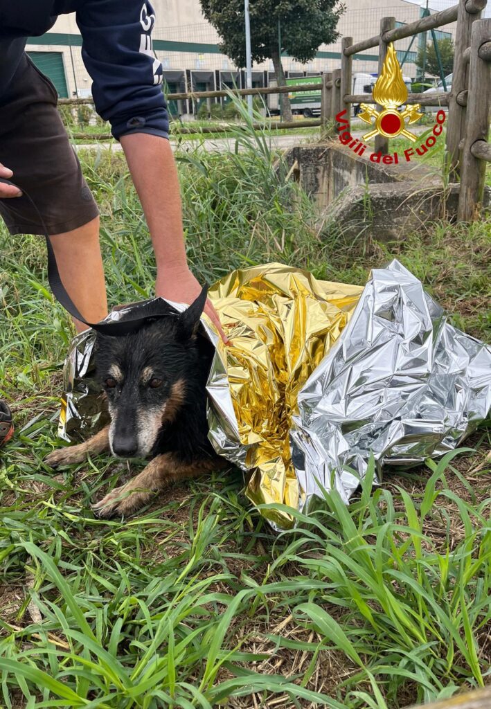 Cane scappa terrorizzato dal tuono e finisce in un canale: salvato dai pompieri