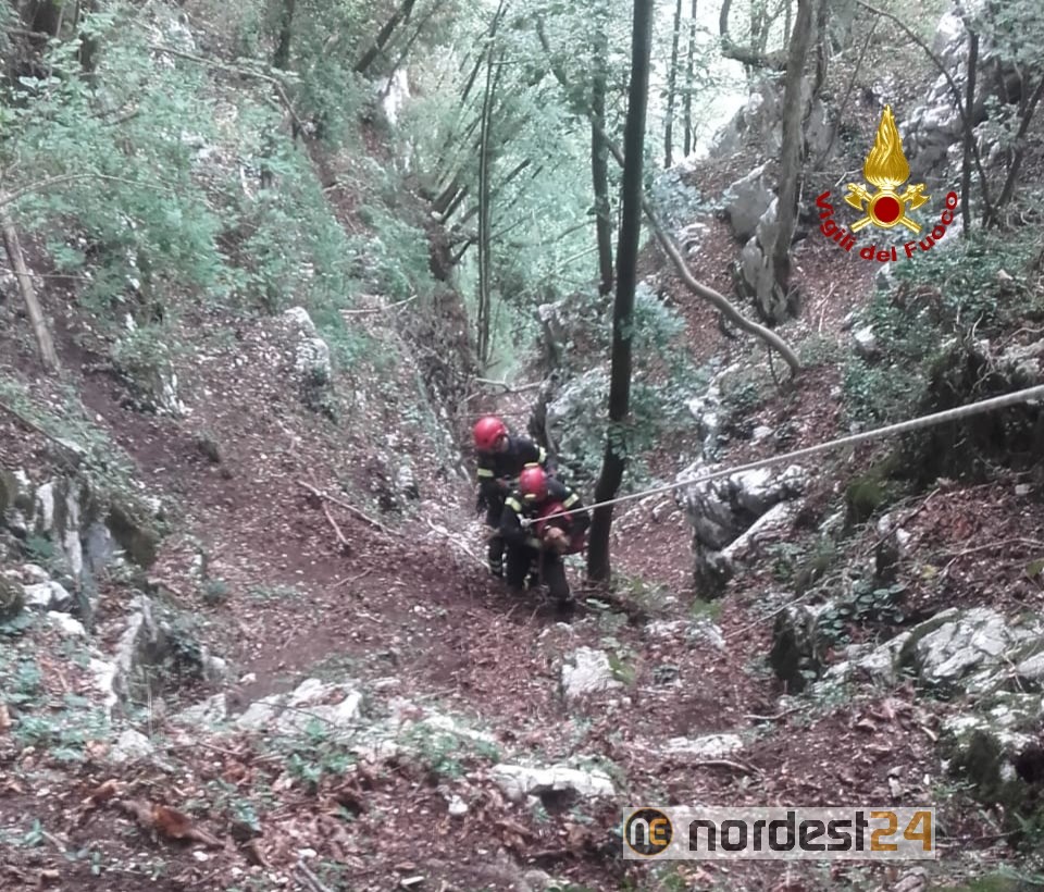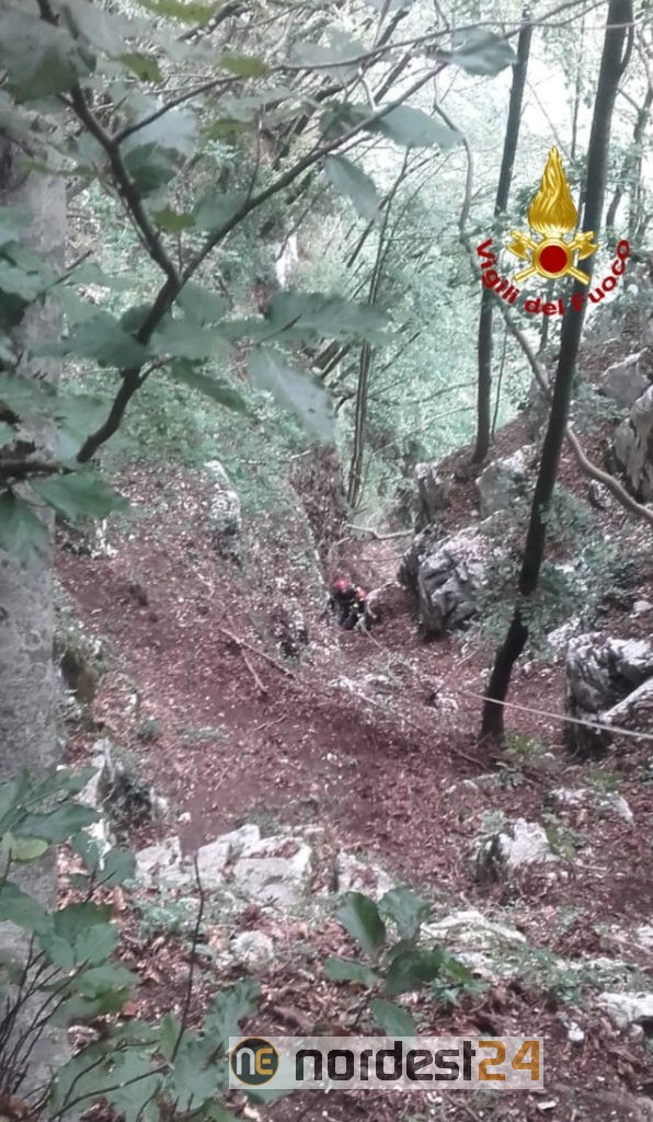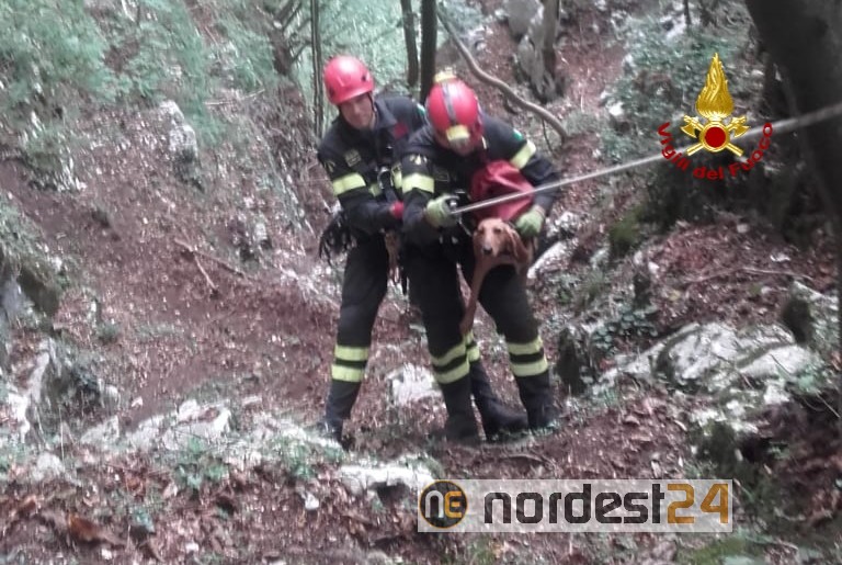 Il primo segugio, precipitato nei primi metri del dirupo, è stato recuperato dal proprietario, mentre per "Brina" ruzzolata per oltre 60 metri per il ripido pendio è stato necessario l'intervento dei vigili del fuoco.
