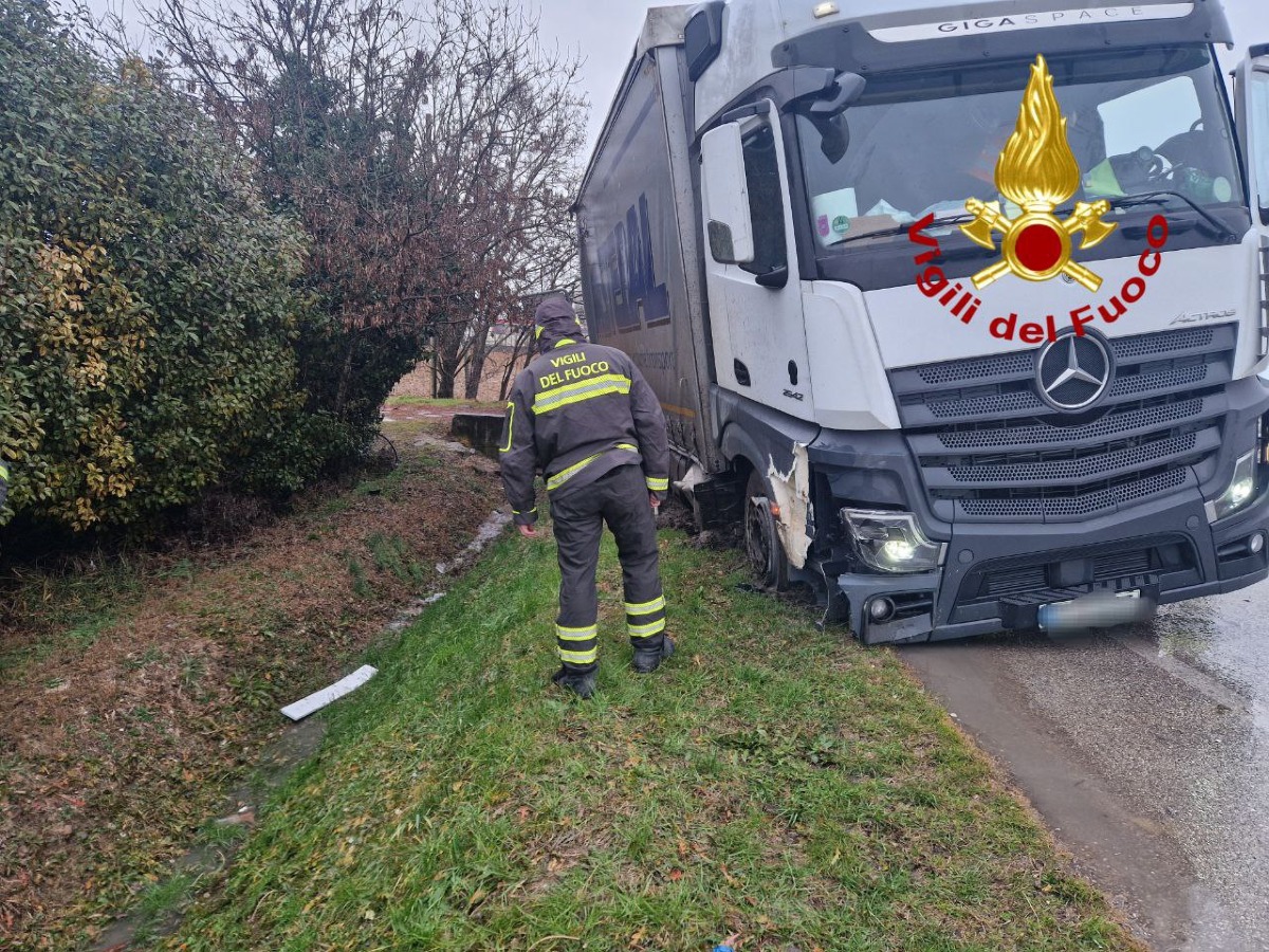 Autoarticolato fuori strada a Castelfranco Veneto: nessun ferito, danni al mezzo e al manto stradale, traffico rallentato.