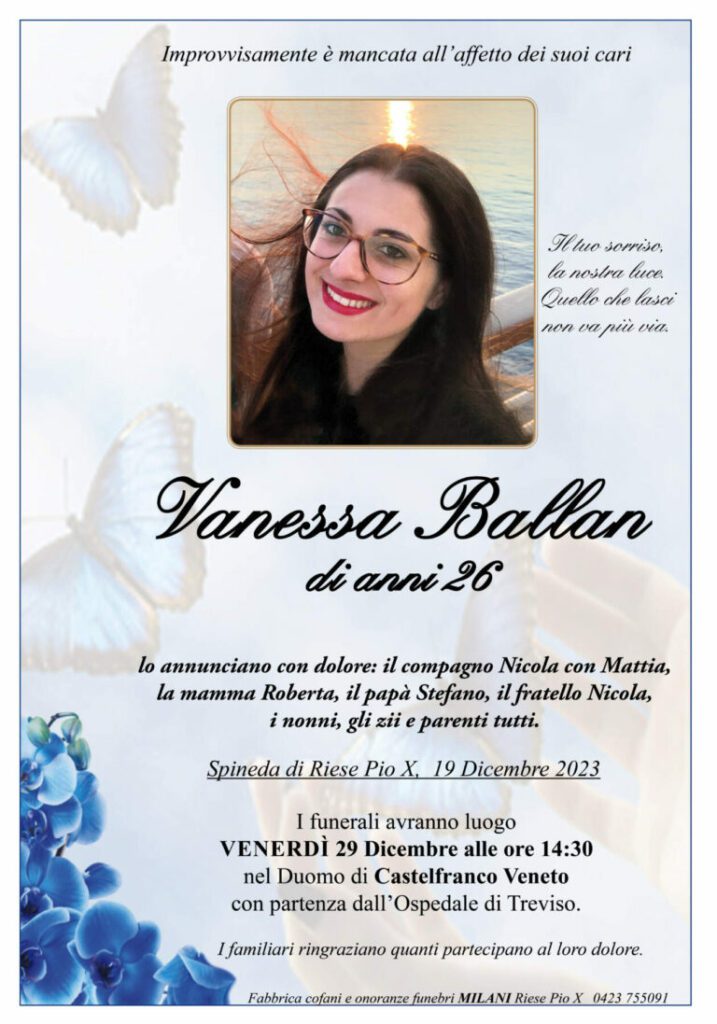 La città di Castelfranco Veneto si ferma oggi per rendere omaggio a Vanessa Ballan, la giovane madre di 26 anni tragicamente assassinata a Riese. Il funerale si svolgerà nel Duomo di Castelfranco Veneto alle 14.30 di questo venerdì 29 dicembre.