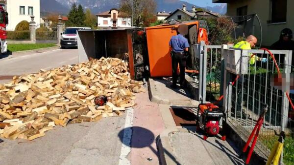 Si ribalta con l'autocarro, il carico di legna invade la strada: ferito il conducente