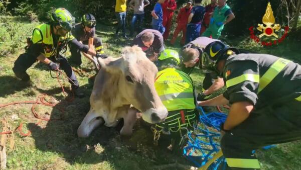 Rimane bloccata, mucca salvata con l'elicottero dai Vigili del fuoco