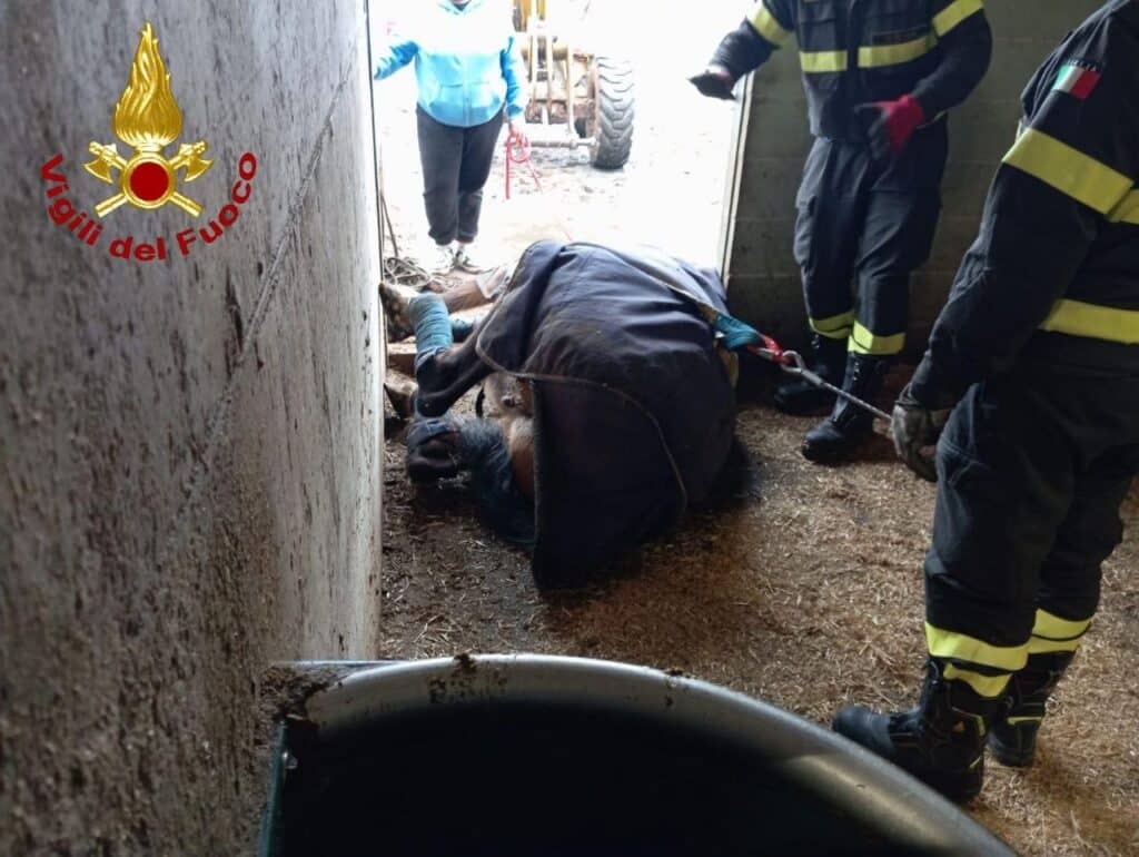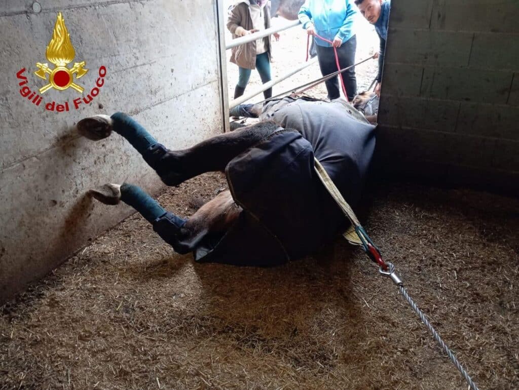L'operazione ha permesso di riportare l'animale in sicurezza all'interno del box dove il veterinario lo ha valutato ed aiutato a rialzarsi.