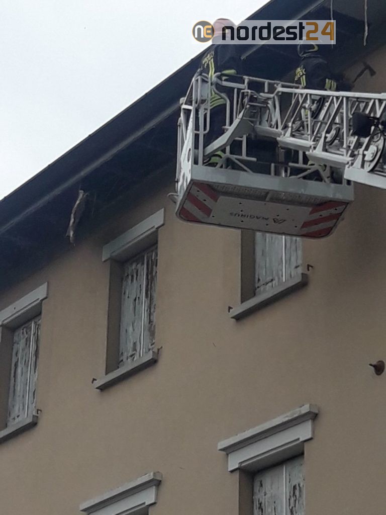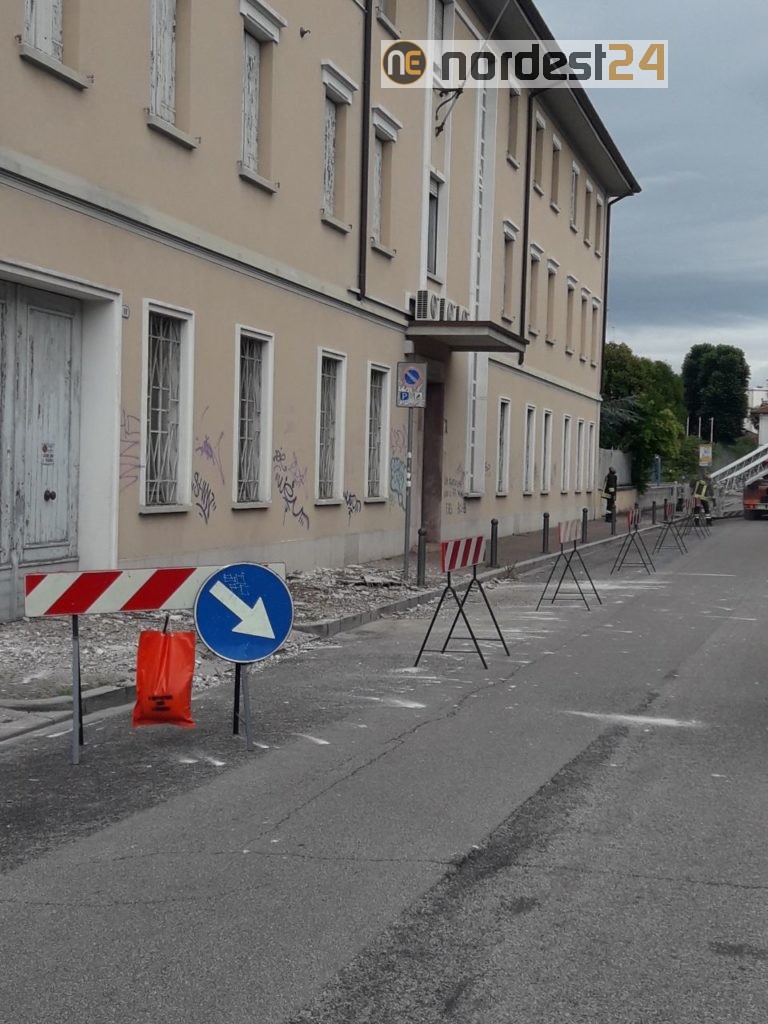 Una parte dell'intonaco e' caduta a terra ed e' stato necessario l'intervento dell'autoscala per rimuovere le parti ancora pericolanti.