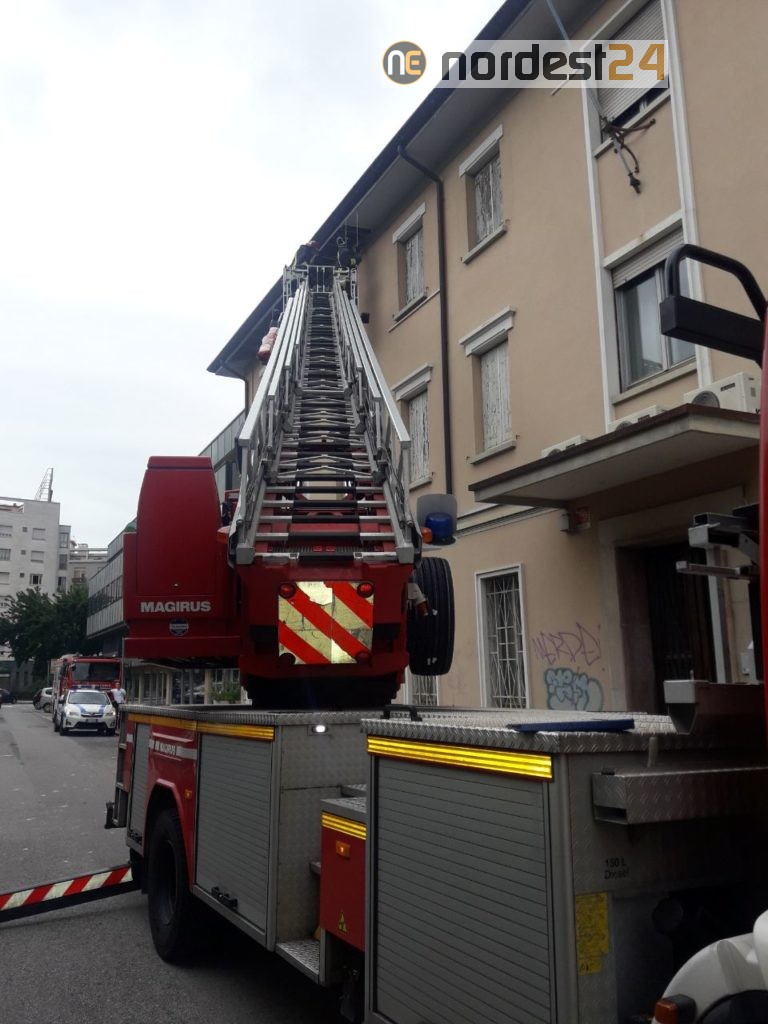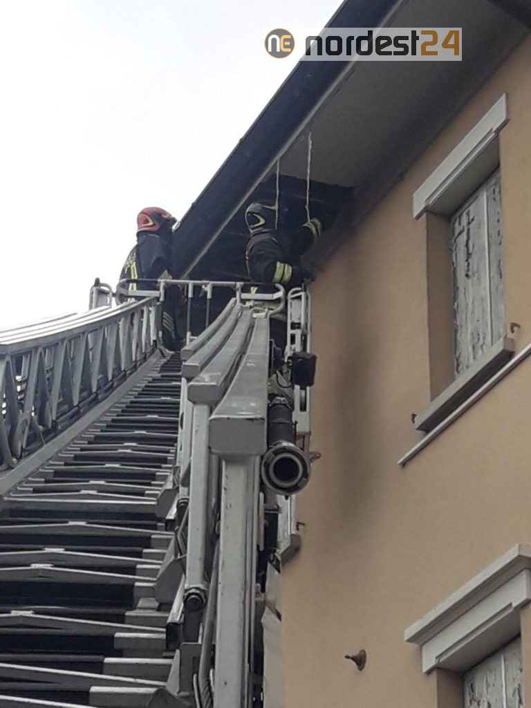 Intervento dei vigili del fuoco nel primo pomeriggio di oggi per la rimozione degli elementi pericolanti dallo sporto della linda di un immobile in via Uccellis a Udine.