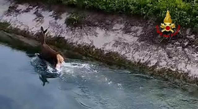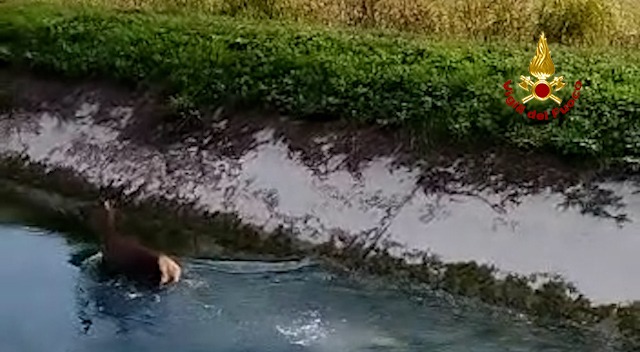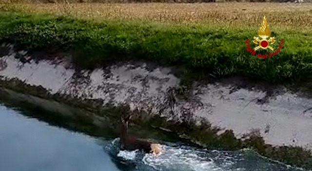Poco dopo mezzogiorno, di domenica, i vigili del fuoco sono intervenuti in canale della Vittoria a Volpago del Montello in provincia di Treviso per salvare un cervo caduto in acqua. L’animale finito nel canale artificiale non riusciva a risalire per le pareti in cemento delle sponde. Il personale di prima partenza dei vigili del fuoco di Treviso è riuscito a recuperare l’animale, che è stato subito liberato in un’area verde sicura della zona.