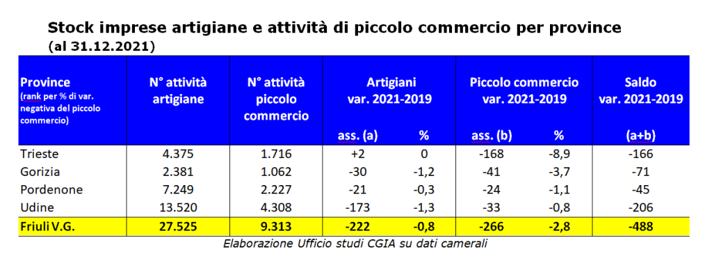 Ormai è una lenta agonia quella che sta vivendo il mondo del lavoro autonomo. Gli effetti economici provocati dal Covid sono stati molto pesanti. In Friuli Venezia Giulia (FVG), dalla fine del 2019 allo stesso periodo del 2021, le due categorie più importanti che caratterizzano il popolo delle partite Iva, vale a dire gli artigiani e i piccoli commercianti titolari di attività di vendita al dettaglio[1], sono diminuite complessivamente di 488 unità, di cui 266 piccoli negozi (-2,8%) e 222 botteghe artigiane (-0,8%). Se poco più di 2 anni fa in regione c’erano oltre 27.700 imprese artigiane, all’inizio di quest’anno sono scese a poco più di 27.500. Pesante anche la contrazione registrata dai piccoli negozi commerciali. Prima della pandemia erano quasi 9.600, due anni dopo sono scesi a poco più di 9.300. A dirlo è l’Ufficio studi della CGIA.