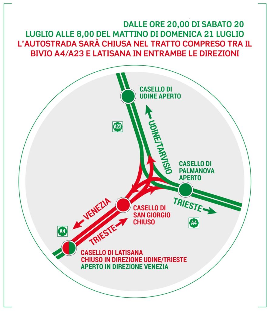 Chi proviene da Venezia ed è diretto a Trieste o a Udine dovrà quindi uscire a Latisana e potrà rientrare in autostrada al casello di Palmanova o a quello di Udine Sud. Chi invece proviene da Trieste ed è diretto a Venezia, dovrà uscire a Palmanova e potrà rientrare in autostrada al casello di Latisana. Infine, chi proviene da Tarvisio potrà proseguire sull’autostrada A4 ma solo verso Trieste; se è diretto a Venezia, invece, dovrà uscire al casello di Udine Sud, seguendo i percorsi alternativi sulla viabilità ordinaria e riprendere l’autostrada a Latisana.