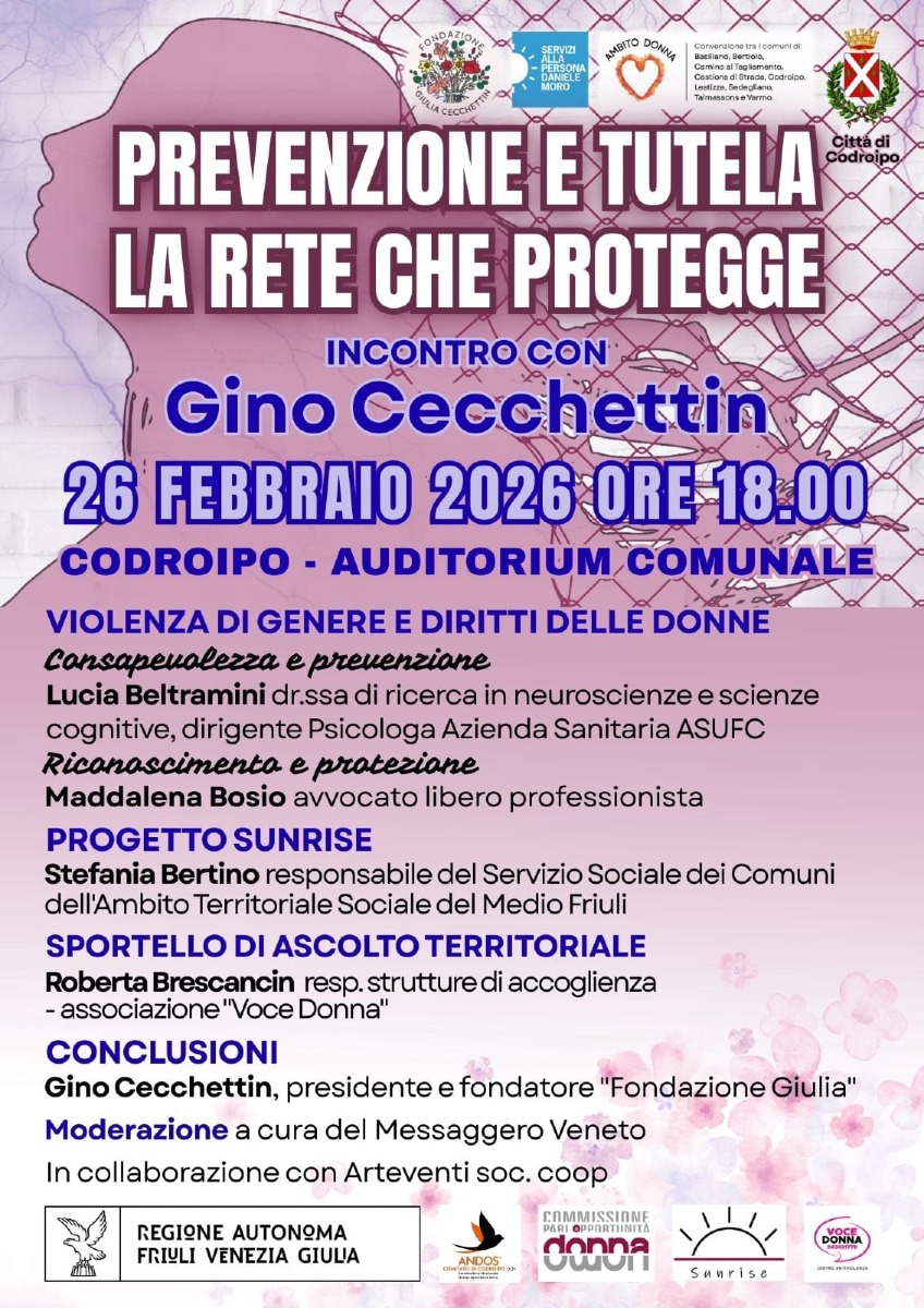 CODROIPO (UD) - L’Amministrazione comunale di Codroipo promuove l’incontro “Prevenzione e tutela. La rete che protegge” con l’obiettivo di ribadire che la prevenzione rappresenta il primo strumento fondamentale per agire concretamente e positivamente nel contrasto alla violenza di genere. A partire dal riconoscimento del ruolo della donna nella società, nella coppia e nella famiglia, prevenire significa comprendere gli aspetti culturali e sociali che stanno alla base dei comportamenti violenti, e analizzare in profondità i rapporti tra generi. È un percorso che chiama in causa l’educazione sentimentale ed emotiva, la responsabilità collettiva e la capacità di costruire reti solide e consapevoli a sostegno delle fragilità.