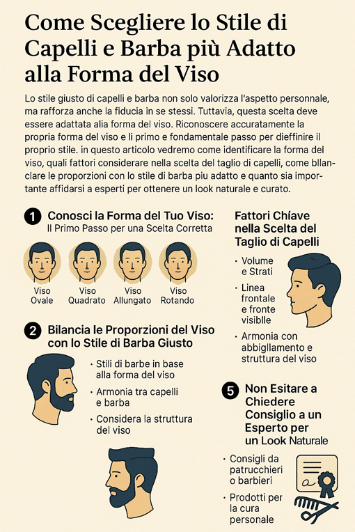 Il taglio di capelli e lo stile di barba giusti non solo migliorano l’aspetto personale, ma aumentano anche la fiducia in sé stessi. Tuttavia, questa scelta deve essere adattata alla forma del viso. Identificare con precisione la propria forma del viso è il primo passo fondamentale. In questo articolo vedremo come riconoscere la forma del proprio viso, cosa considerare nella scelta di un taglio, come bilanciare le proporzioni con la barba giusta, come armonizzare il look con lo stile personale e quando è utile rivolgersi a un esperto per un risultato naturale e curato.