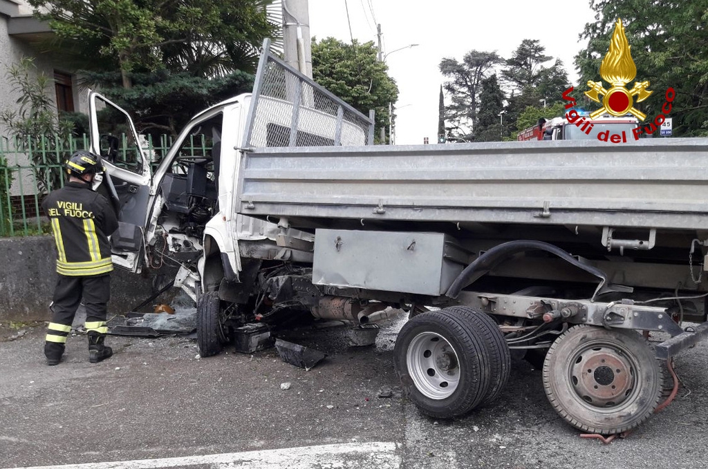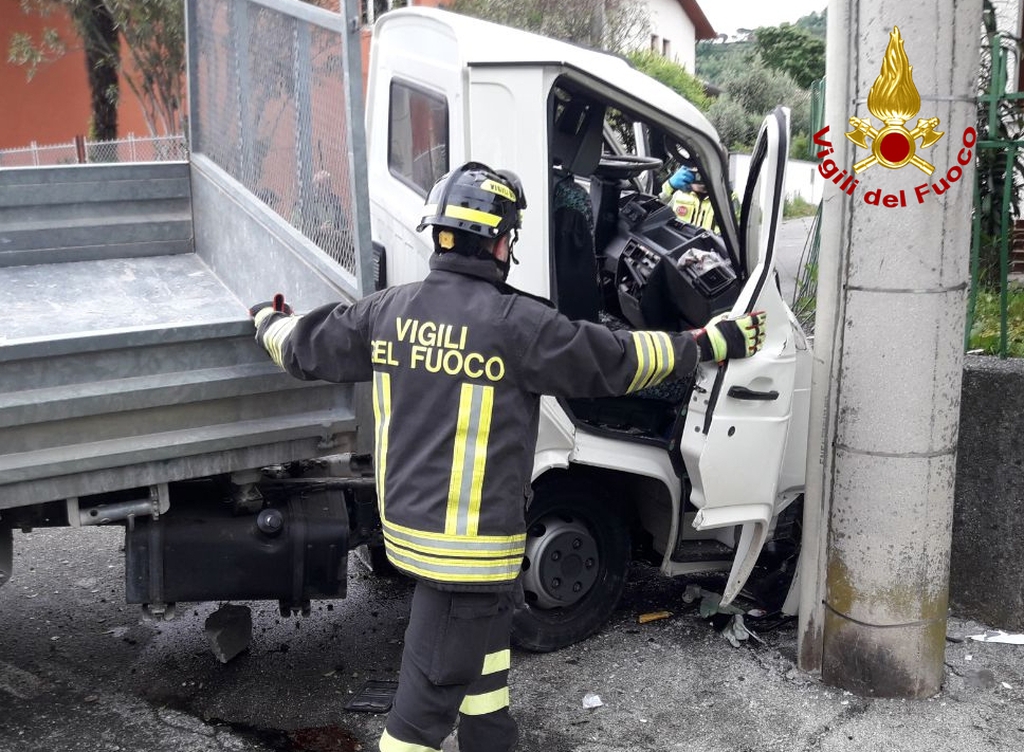 Con l'autocarro piomba contro un muro e un palo di cemento: autista incastrato e ferito