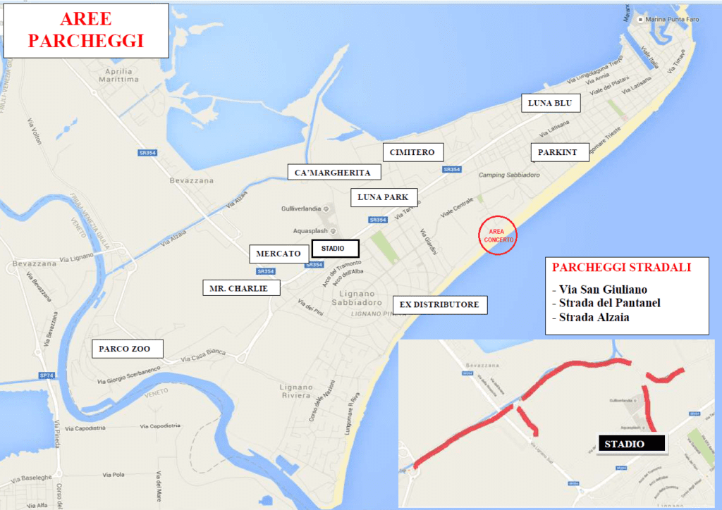 Nel parcheggio dello Stadio Teghil risulta possibile la sosta gratuita degli autoveicoli per una buona parte, in quanto una zona dello stesso sarà allestita con Casse per il ritiro ticket. Sono disponibili le seguenti ulteriori aree a parcheggio degli autoveicoli: parcheggio della discoteca Mr. Charlie all’entrata di Lignano (gratuito); area del mercato adiacente lo Stadio Teghil con ingresso da Viale Europa (gratuito); parcheggio del Luna Park accessibile da Viale Europa; parcheggio dell’area del Cimitero Comunale accessibile da Via Lovato (gratuito); parcheggio della discoteca Ca’ Margherita accessibile da Via Alzaia (gratuito); parcheggio Luna Blu accessibile da Via dello Stadio; parcheggio multipiano Parkint accessibile da Via Amaranto, oltre al parcheggio del Parco Zoo accessibile da Via Scerbanenco (zona Riviera, gratuito) e parcheggio ex-distributore accessibile da Lungomare Kechler. Oltre a tali aree, sarà consentita la sosta gratuita degli autoveicoli anche lungo le strade di Via San Giuliano, Strada del Pantanel e Via Alzaia, la cui viabilità risulta modificata.
