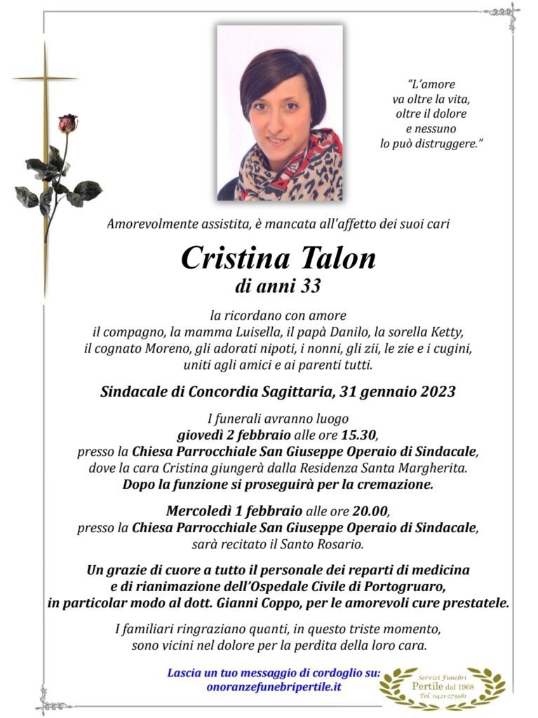 La scomparsa di Cristina Talon ha sconvolto la comunità di Sindacale di Concordia Sagittaria in provincia di Venezia. La giovane mamma di 33 anni è stata stroncata da una emorragia cerebrale che l'ha costretta a un lungo e difficile percorso per lottare contro quel male.