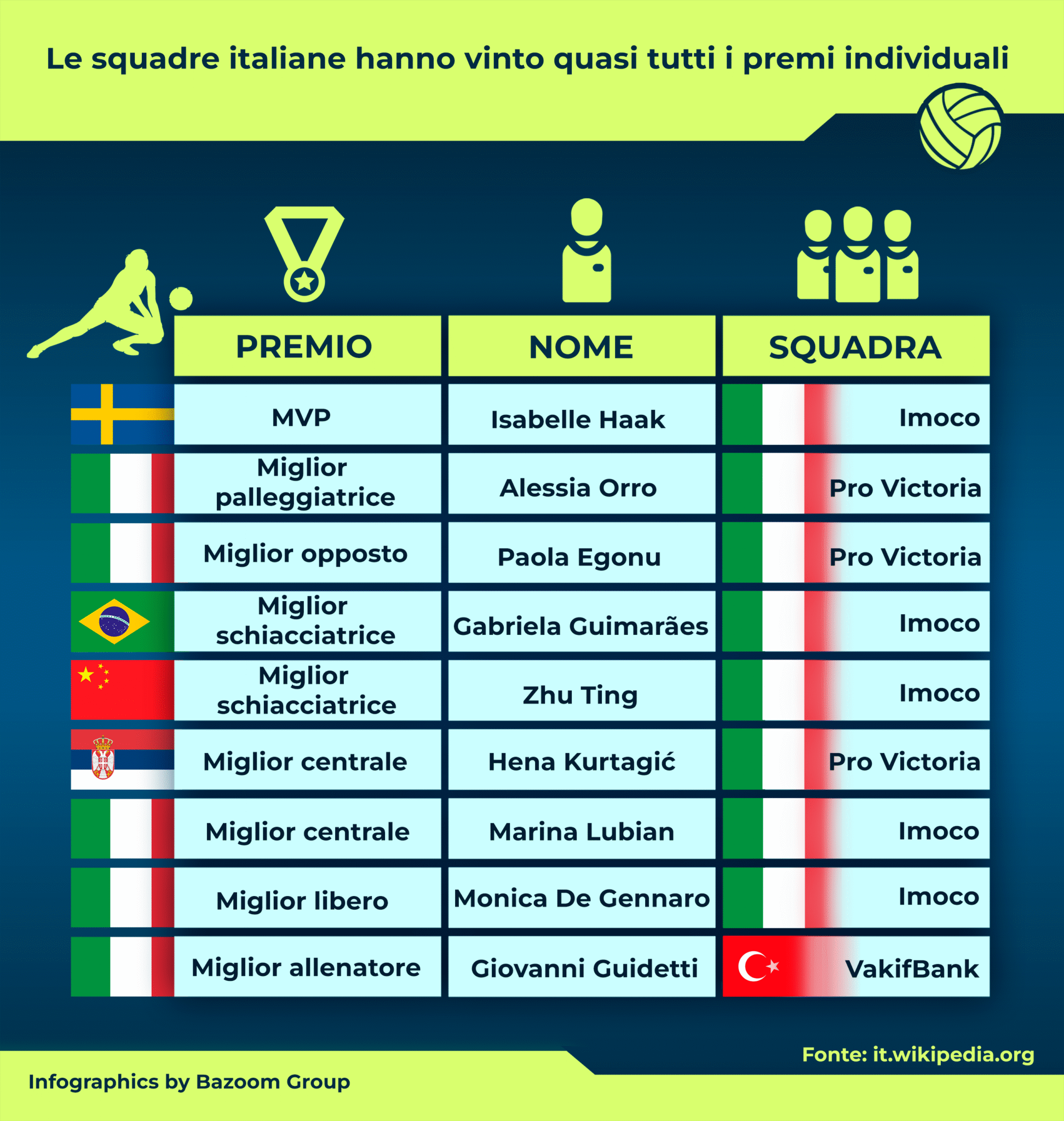Questa Champions League è motivo di orgoglio per la pallavolo italiana. Tre squadre italiane nelle prime quattro d'Europa e un podio occupato interamente da club di Serie A1. Era dalla “Golden League” degli anni 2000 che l'Italia non così a livello di club femminili. Oggi come non mai, la Serie A1 italiana si conferma il campionato più competitivo e qualitativo del mondo.