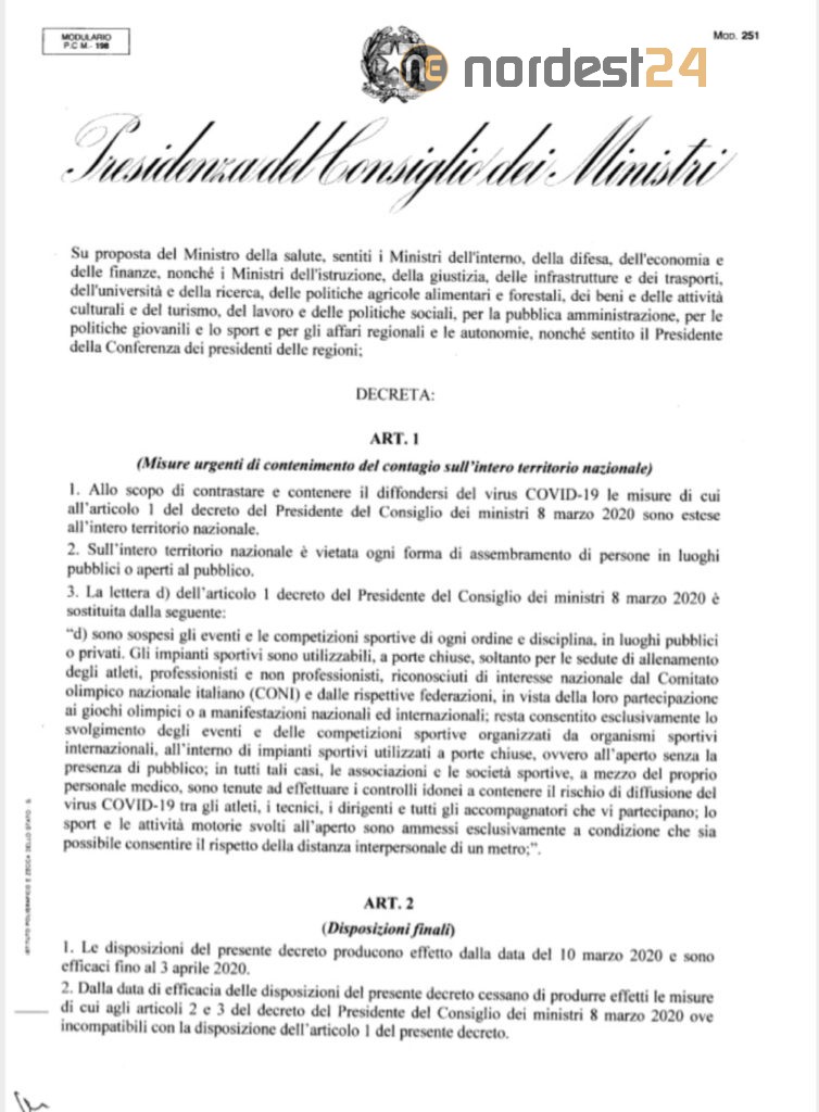 Il provvedimento estende le misure di cui all'art. 1 del Dpcm 8 marzo 2020 a tutto il territorio nazionale. È inoltre vietata ogni forma di assembramento di persone in luoghi pubblici o aperti al pubblico. In ultimo, è modificata la lettera d dell'art.1 del Dpcm 8 marzo 2020 relativa agli eventi e manifestazioni sportive.