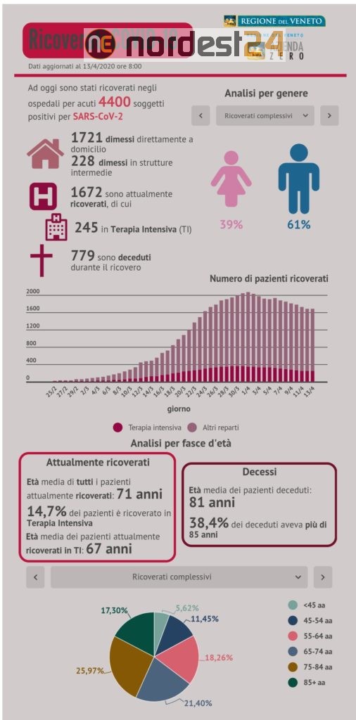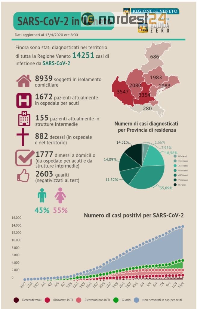I dati diffusi dalla Regione Veneto aggiornati alle 8 di oggi contano 81 infezioni in più rispetto a ieri pomeriggio, numeri che portano il totale dei contagi dall'inizio dell'emergenza a 14.251.