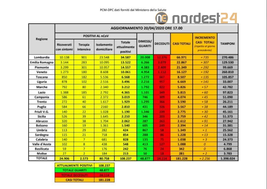 Coronavirus, il Bollettino della Protezione Civile di oggi 20 aprile 2020
