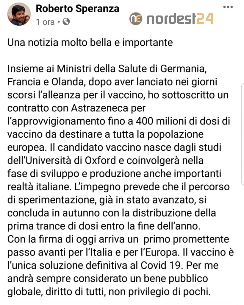 "Insieme ai Ministri della Salute di Germania, Francia e Olanda, dopo aver lanciato nei giorni scorsi l’alleanza per il vaccino, ho sottoscritto un contratto con Astrazeneca per l’approvvigionamento fino a 400 milioni di dosi di vaccino da destinare a tutta la popolazione europea. Il candidato vaccino nasce dagli studi dell’Università di Oxford e coinvolgerà nella