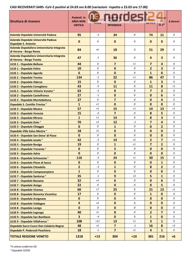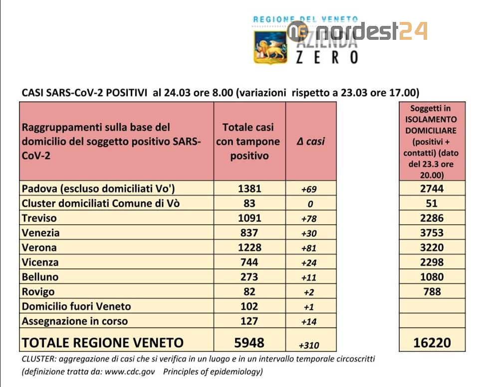 Coronavirus Veneto, aggiornamento 24 marzo 2020: numeri e tabelle contagi