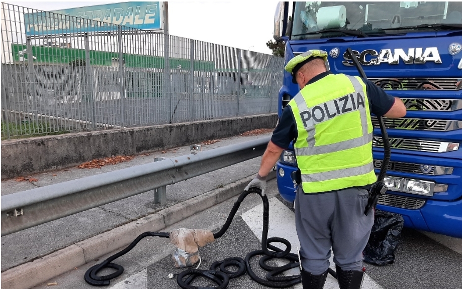Gli operatori della Polizia Stradale, in virtù del precedente criminoso, decidevano di eseguire una perquisizione sul mezzo, rinvenendo all’interno delle tasche laterali del cabinato, 1 pompa elettrica avvolta con degli stracci imbevuti di gasolio e collegata a dei lunghi tubi di plastica di fabbricazione artigianale.
