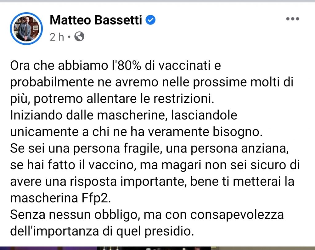 "Ora che abbiamo l'80% di vaccinati e probabilmente ne avremo nelle prossime molti di piu', potremo allentare le restrizioni. Iniziando dalle mascherine, lasciandole unicamente a chi ne ha veramente b...