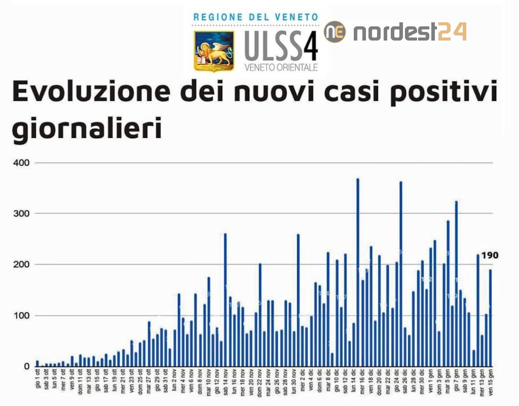 I contagiati al 15 gennaio sono così distribuiti: Annone Veneto 16; Caorle 148; Cavallino Treporti 87; Ceggia 45; Cinto Caomaggiore 21; Concordia Sagittaria 59; Eraclea 139; Fossalta di Piave 45; Fossalta di Portogruaro 39; Gruaro 21; Jesolo 285; Meolo 39; Musile di Piave 92; Noventa di Piave 41; Portogruaro 184; Pramaggiore 42; San Donà di Piave 348; San Michele al Tagliamento 37; San Stino di Livenza 152; Teglio Veneto 7; Torre di Mosto 46. L’attuale numero di positività rappresenta lo 0,8% della popolazione residente nel Veneto orientale.