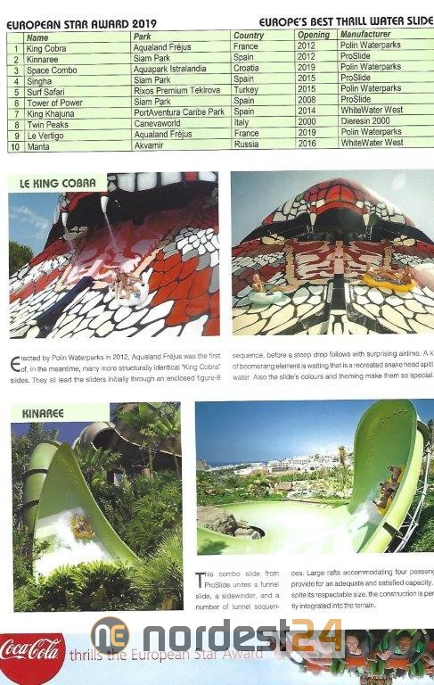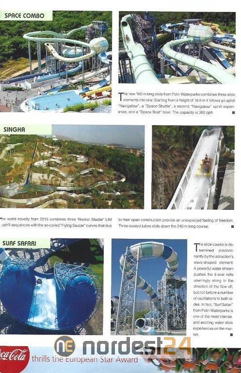 Una giuria internazionale indipendente, costituita da 43 membri provenienti da Germania, Italia, Spagna, Belgio, Svizzera, Paesi Bassi, Gran Bretagna, Francia, Austria, Polonia, Svezia, Turchia, USA e Russia, e composta dal prof. dr. Salvador Anton Clavé, da Bas Bakkers, Nergis Aslan, Victor Cavaller, Rik Engelen e Francesco Fabris, dal dott. Felix Fritz, Marcus Gaines, Marshal Hill, Marc Lacombe, Alex Lemmens, Francois Mayne, Shaun McKeogh, Yves Merienne, Frederic Pastuszak, Wolfgang Payer, Jochen Peschel, Marek Pisarski, Owen Ralph, Sven Popelier e Darya Ratmanskaya, dal dott. Igor Radionov, Adam Sandy, Dennis L. Spiegel, dall’ingegner Werner Stengel, Francis Stokkel, dal dott. Sasha Szabo, dal prof. dr. Torsten Widmann, Piotr Wiecha, Melanie Yankers - Leuterbach, Christopher Straube, Susan L. Stareey, Marc Spies, Wieland Schwarzkopf, Martin J. Palicki, Mario O. Mamon, Thomas Frank, Jessica De Jong, David Callen, Frank Lanfer, Agi Reddersen, Karl Ruisinger e Gerd Reddersen ha valutato la qualità, la capacità di entusiasmare e la sicurezza dello scivolo acquatico Space Combo assegnandogli un eccellente 3° posto per lo scivolo più entusiasmante d’Europa in una categoria caratterizzata da un’agguerrita concorrenza.