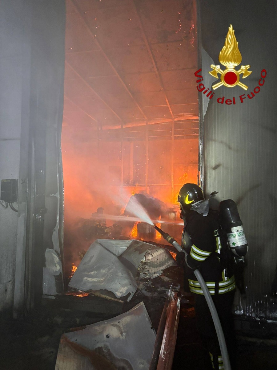L’allarme è scattato nelle prime ore del mattino, facendo intervenire rapidamente più squadre sul posto. Il rogo ha coinvolto una struttura utilizzata come deposito, generando una colonna di fumo visibile anche a distanza.