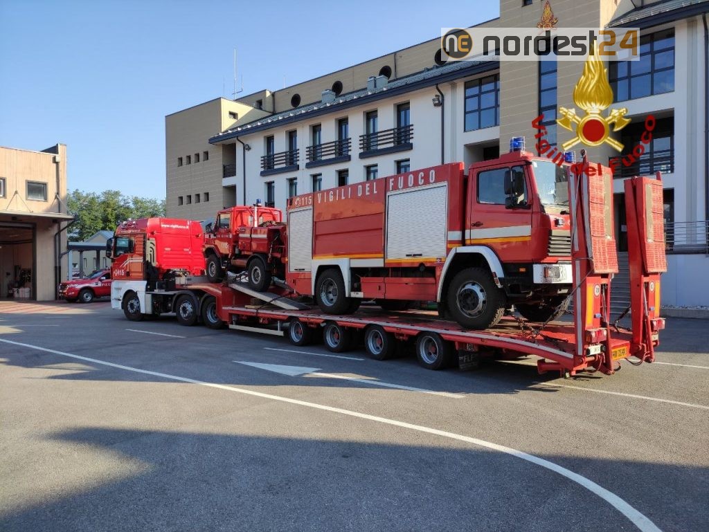 Treviso, un modulo operativo antincendio completo che comprende 9 vigili del fuoco, un'autopompa, un'autobotte, 2 fuoristrada con modulo antincendio boschivo.