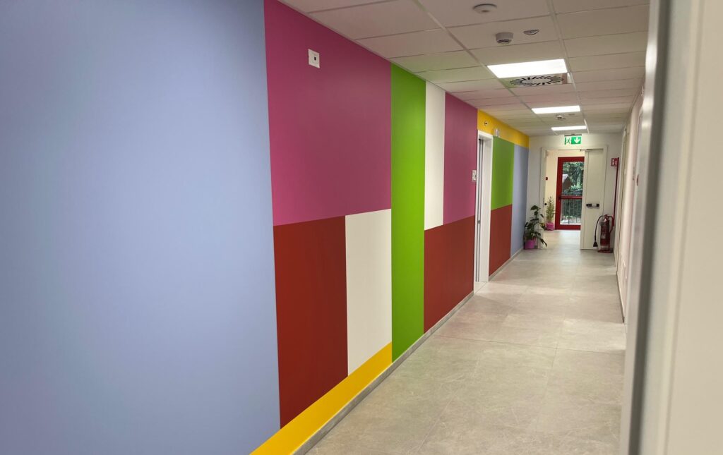 Il nuovo edificio è progettato con ampie finestre che assicurano una illuminazione naturale abbondante. La tinteggiatura vivace e colorata delle pareti crea un ambiente stimolante e accogliente. Le stanze da letto sono decorate con disegni realizzati dagli stessi utenti, rendendo l’ambiente ancora più personalizzato e rassicurante.