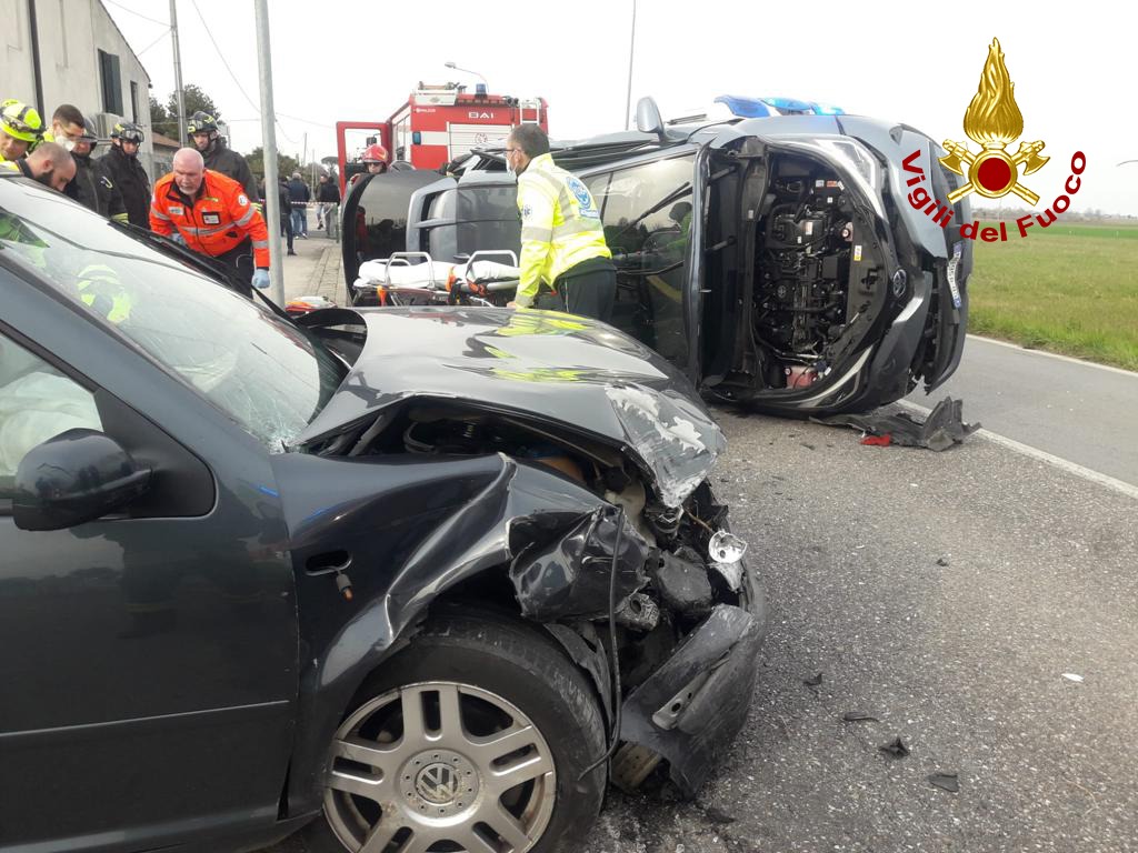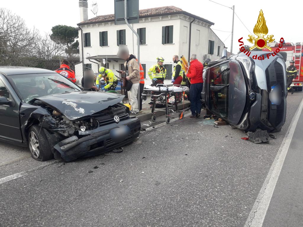 CORREZZOLA (PADOVA). Alle 15:15, di oggi domenica, i vigili del fuoco sono intervenuti in via Pegolotte a Correzzola per un'auto finita ribaltata sul fianco dopo lo scontro contro un altro mezzo: 4 feriti, due per ogni auto.