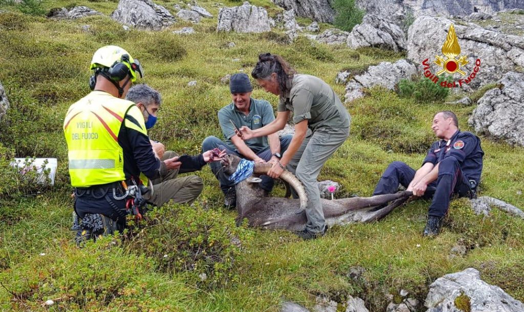 L’aiuto per uno stambecco ferito era arrivato dal cielo con il trasporto da parte dell’elicottero dei vigili del fuoco Drago 139 di un veterinario e di una guardia provinciale nei pressi del lago di Sorapis a circa 2000 metri di quota.