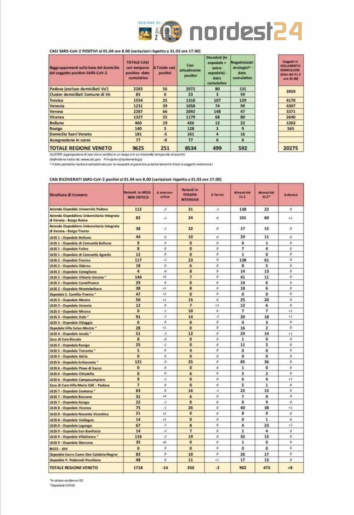 CONTAGIATI – 9625 (IERI 9155, +470, +5,1% DA NOTARE CHE LA REGIONE VENETO HA AUMENTATO IL NUMERO DEI TAMPONI GIORNALIERI DI ALMENO 1000 UNITà)IN ISOLAMENTO DOMICILIARE – 6182TOTALE RICOVERATI – 2068 (...