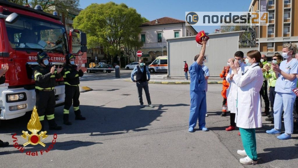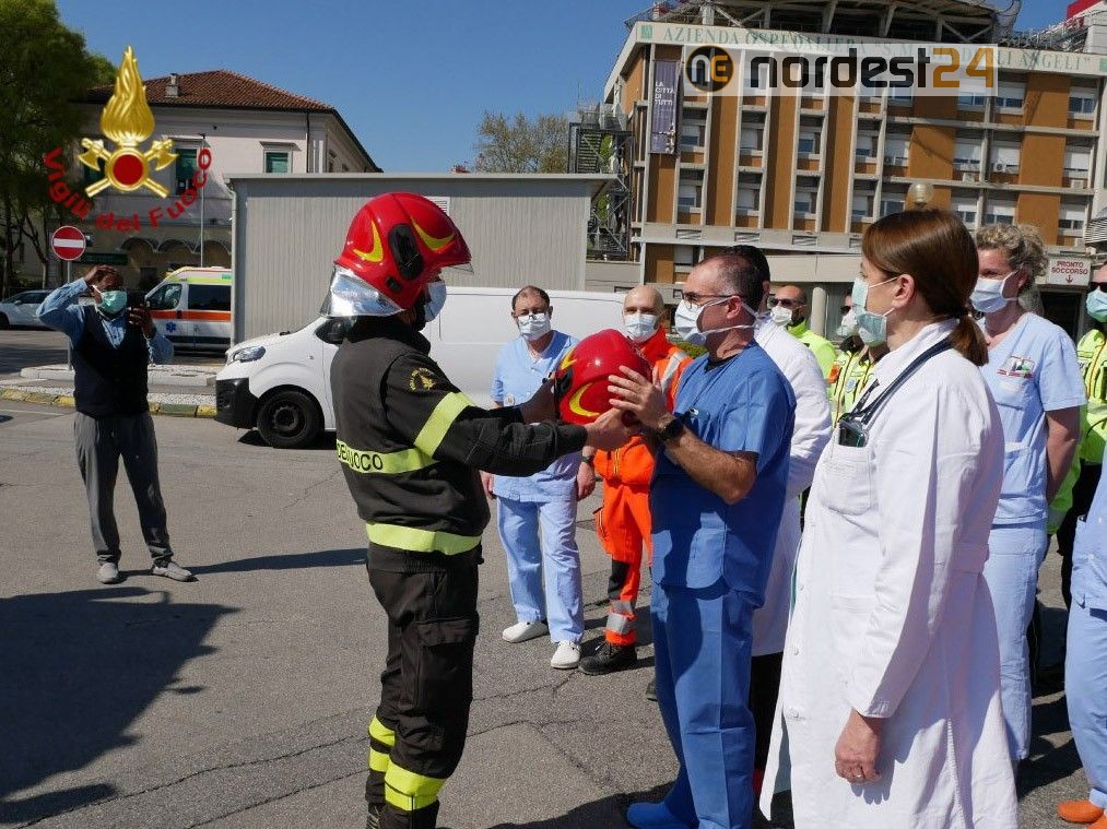 Di qui l’atto simbolico della consegna da parte di un vigile del fuoco di un casco rosso direttamente nelle mani del dott. Thomas Pellis che lo riceveva a nome di tutti, medici, personale infermieristico ed altri che da settimane stanno dando il proprio inestimabile contributo su questo fronte.