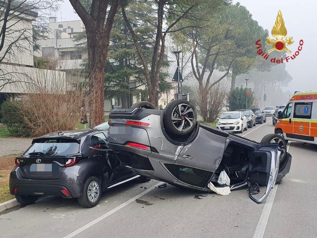 Esce di strada, si ribalta e urta 4 auto sosta: ferita la conducente
