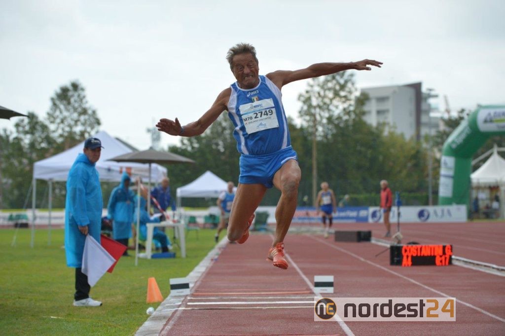 Nel triplo anche il marchigiano Giuliano Costantini (Gs Atl. Effebi Fossombrone) riconquista il titolo europeo dopo quello del 2014, stavolta nella categoria M70 con 10.50 (+0.1). Una medaglia da dedicare al fratello Paolo, specialista dei lanci, che è venuto a mancare appena un mese fa: “Eravamo molto legati, mi ha aiutato da lassù”, racconta il marchigiano di Sant’Ippolito, la stessa località del centenario Giuseppe Ottaviani che potrebbe essere in gara agli Europei master nel lungo, venerdì prossimo. Cade una migliore prestazione italiana: nelle batterie dei 300 ostacoli l’altoatesino Rudolf Frei (Sportclub Merano) con 53”69 toglie un centesimo al suo limite SM70.