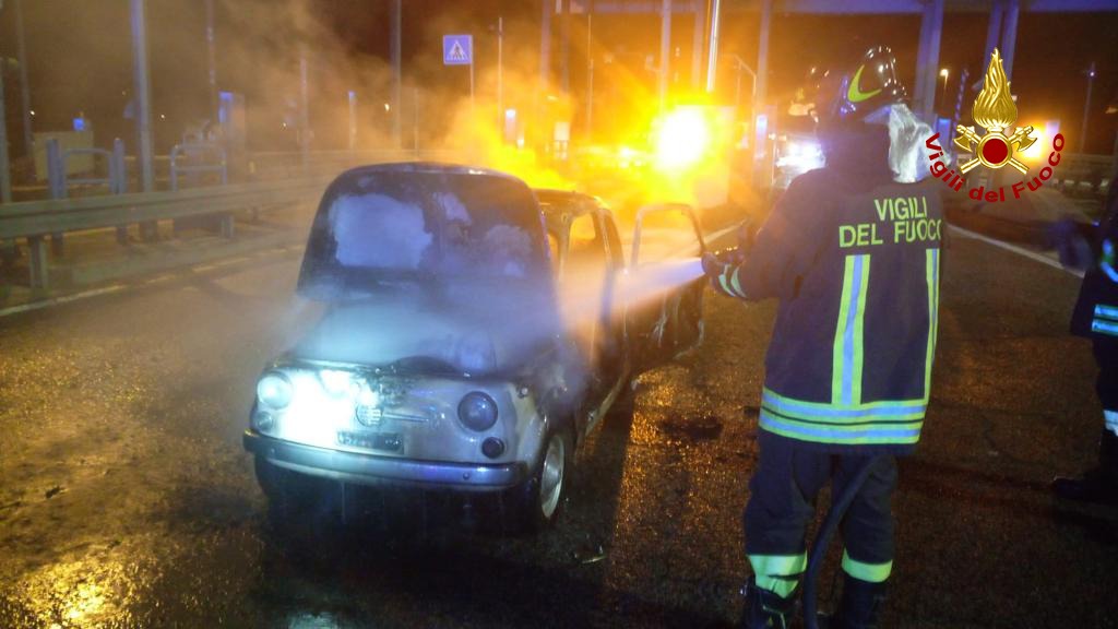 Fiat 500 anni 60 a fuoco all'uscita del casello: distrutta