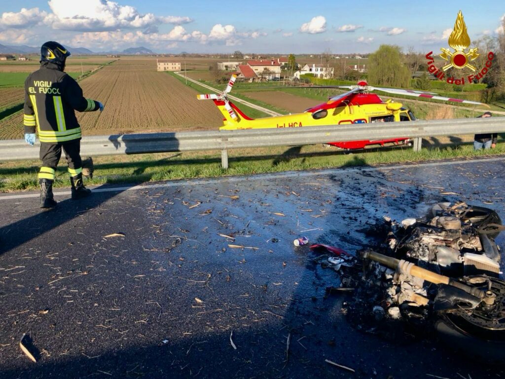 I pompieri accorsi da Este con due automezzi, hanno spento le fiamme, mentre il motociclista è stato preso in cura dal personale sanitario del Suem, stabilizzato ed elitrasportato in ospedale.