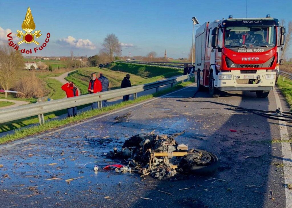 SANT’URBANO (PADOVA). Alle ore 16, di oggi, domenica 25 febbraio, i vigili del fuoco sono intervenuti lungo la SP 7 in località Balduina a Sant’Urbano in provincia di Padova per l’incidente di un motociclista finito per terra dopo la perdita di controllo della moto che ha preso fuoco: ferito il centauro.