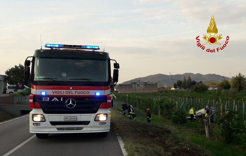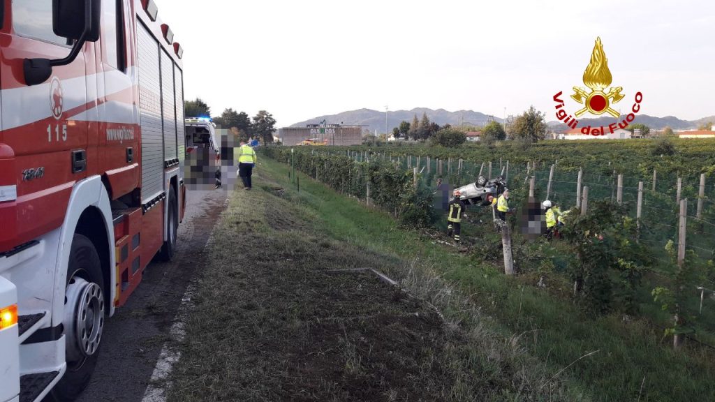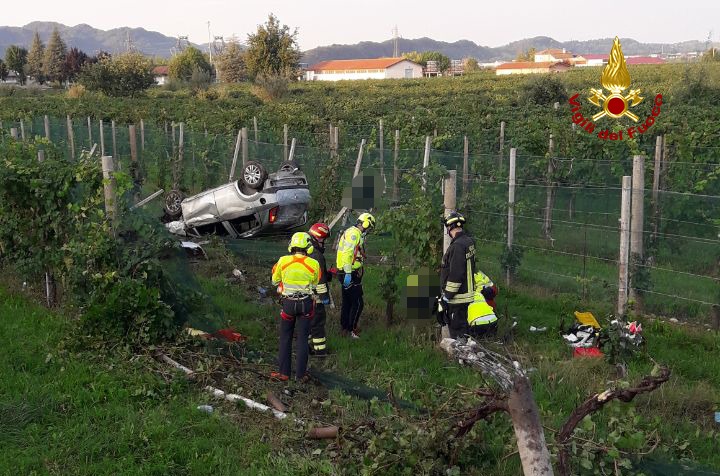 VALDOBBIADENE. Alle 7 di oggi sabato 3 settembre 2022, i vigili del fuoco sono intervenuti in Via Erizzo a Valdobbiadene in provincia di Treviso per un'auto finita rovesciata in un vigneto, dopo la perdita di controllo del conducente rimasto ferito insieme ad altre 4 persone (dai 19 ai 16 anni). Secondo alcuni testimoni il mezzo procedeva ad alta velocità ed è uscito di strada autonomamente in un tratto rettilineo.