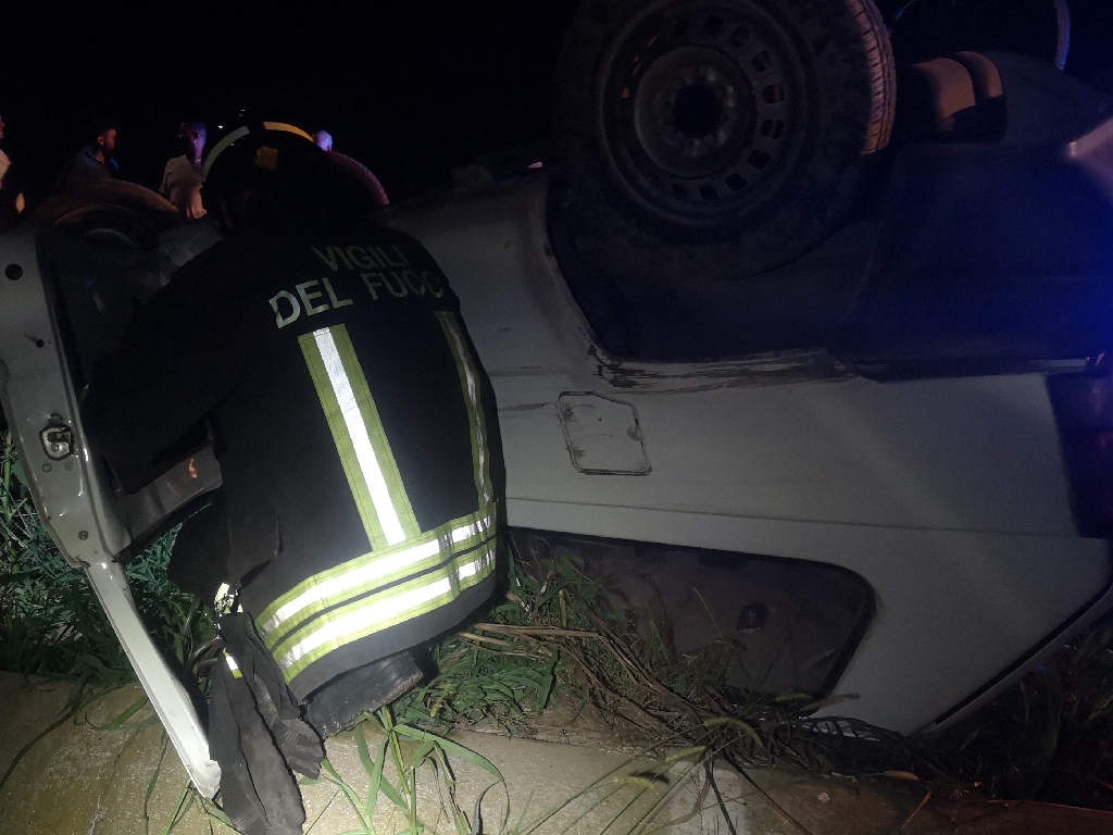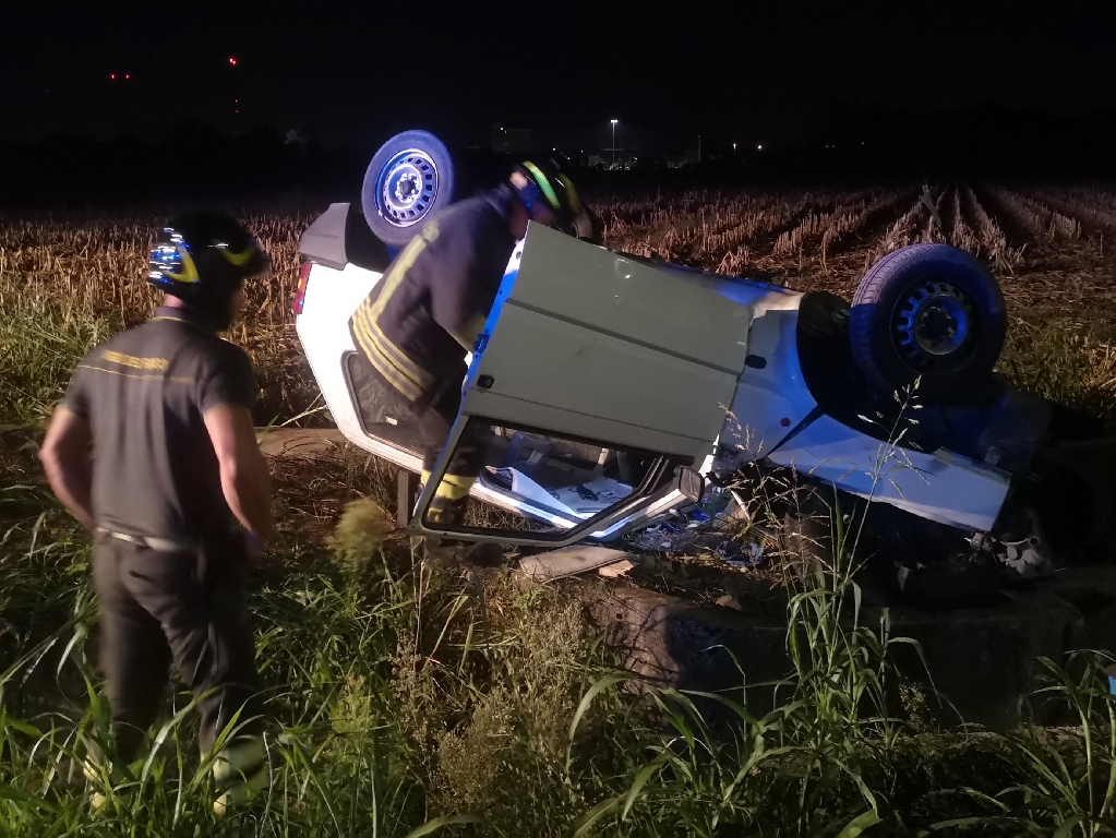 Erano circa le 22.45 quando due giovani, a bordo di una Fiat Panda, hanno perso il controllo del veicolo uscendo di strada e ribaltandosi, dopo aver urtato una canaletta irrigua agricola.