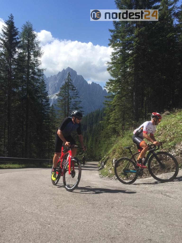 Il pilota, grande appassionato di ciclismo ha scelto la salita delle Sorgenti del Piave, per mettersi alla prova in un percorso molto impegnativo.