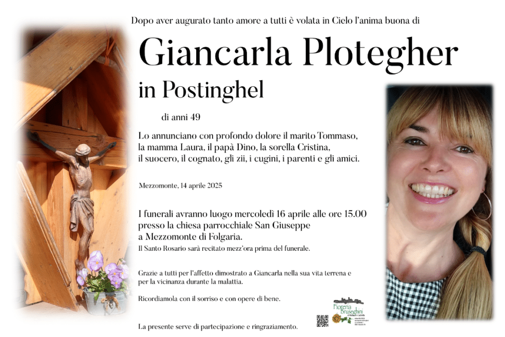 L’ultimo saluto a Giancarla Plotegher verrà dato mercoledì 16 aprile alle ore 15.00 presso la chiesa parrocchiale San Giuseppe di Mezzomonte di Folgaria. Il Santo Rosario sarà recitato mezz’ora prima dell’inizio della celebrazione.