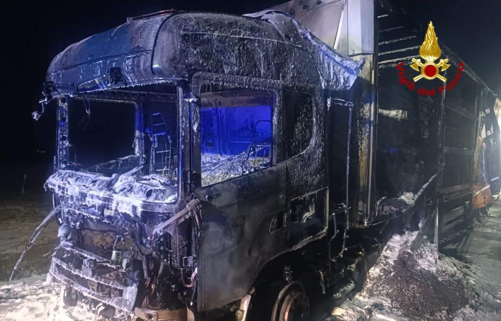 L’autista era fermo per la foratura di uno pneumatico ed era in attesa dell’assistenza di un gommista, quando sono divampate le fiamme.