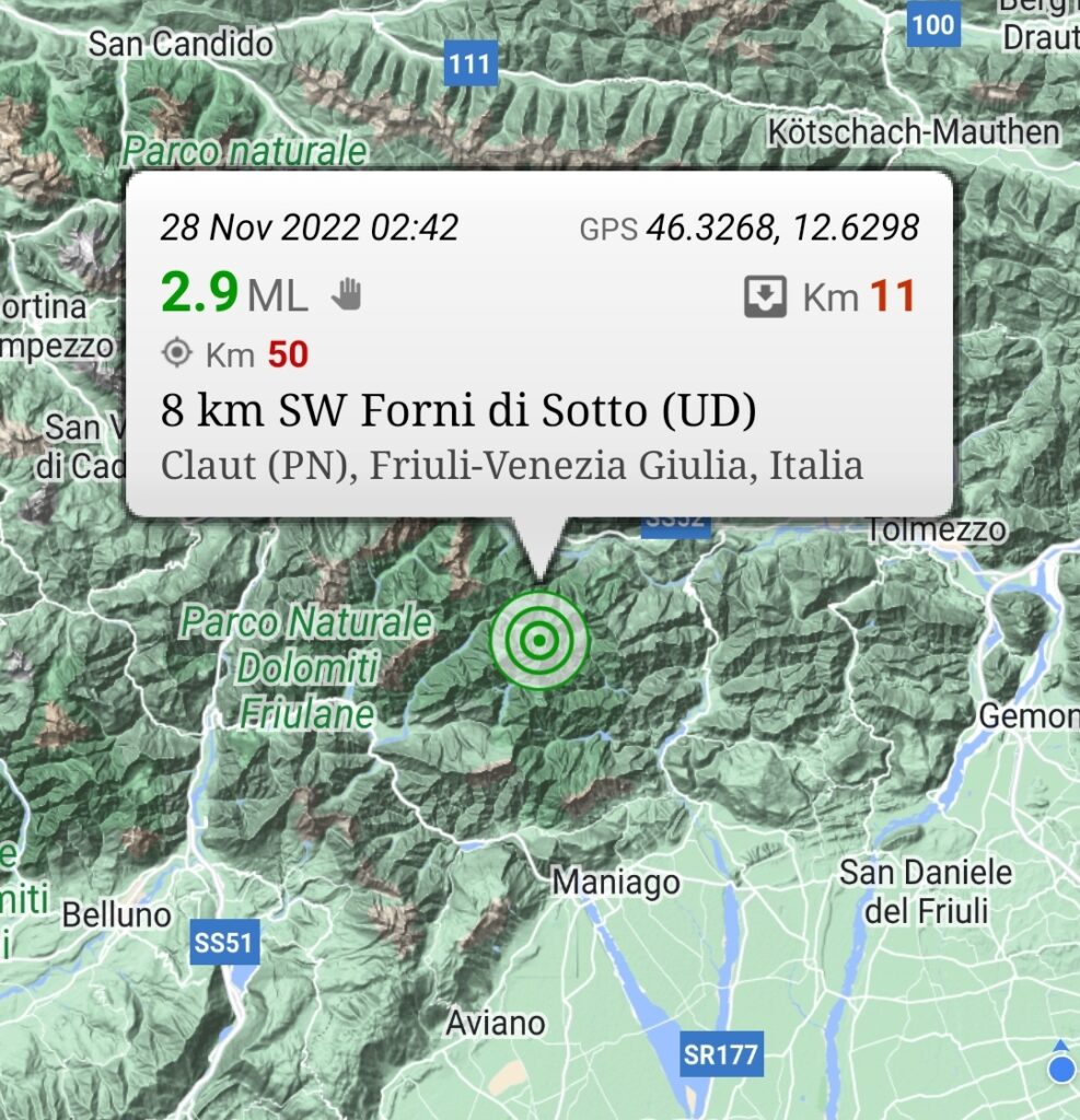 Un terremoto di magnitudo ML 2.9 si è registrato nella zona a 8 km SW Forni di Sotto (UD) alle ore 02:42 con coordinate geografiche (lat, lon) 46.3270, 12.6300 ad una profondità di 11 km.