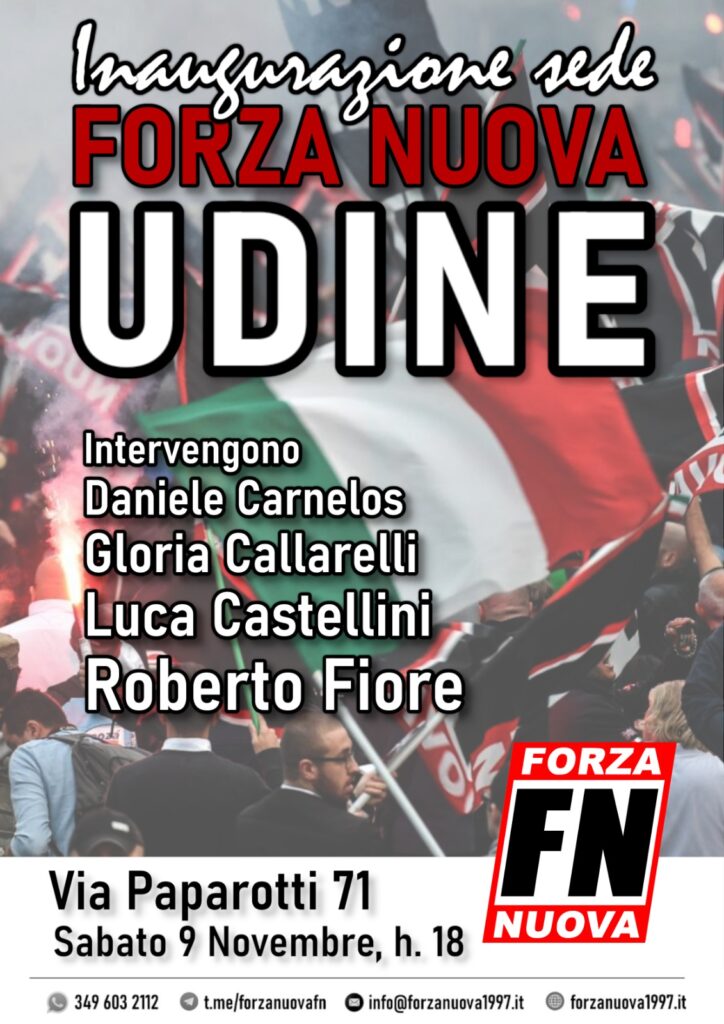 UDINE - Oggi, sabato 9 novembre, alle ore 18, Forza Nuova inaugurerà la sua nuova sede in via Paparotti a Udine. Alla cerimonia di apertura sarà presente il segretario nazionale del movimento, Roberto...
