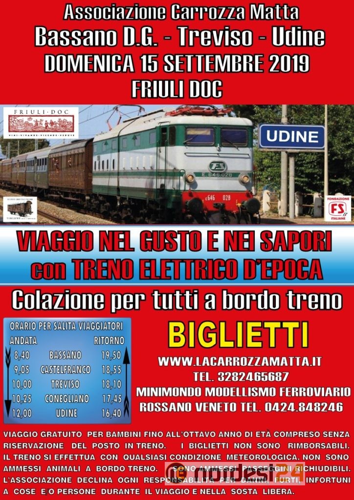 Domenica 15 settembre, infatti, un treno storico a trazione elettrica partirà da Bassano del Grappa per arrivare a Udine (andata e ritorno). La partenza da Bassano è prevista per le 8:40 con arrivo a Udine alle 12:00. Il ritorno, invece, è previsto per le 16:40 con arrivo a Bassano alle 19:50. Le fermate intermedie previste, sia all'andata che al ritorno, saranno a Castelfranco, Treviso e Conegliano.