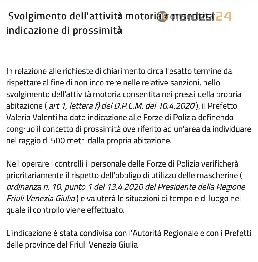 In relazione alle richieste di chiarimento circa l'esatto termine da rispettare al fine di non incorrere nelle relative sanzioni, nello svolgimento dell'attività motoria consentita nei pressi della propria abitazione ( art 1, lettera f) del D.P.C.M. del 10.4.2020 ), il Prefetto Valerio Valenti ha dato indicazione alle Forze di Polizia definendo congruo il concetto di prossimità ove riferito ad un'area da individuare nel raggio di 500 metri dalla propria abitazione.